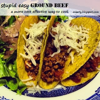 I make a big batch a the beginning of the week, and use the beef for tacos, enchiladas, salads, and even chili. This week, I used 2 pounds of lean ground beef and made tacos and spicy beef chili. All in all, one batch gave us 6 meals for the two of us (3 dinners and 3 lunches each).